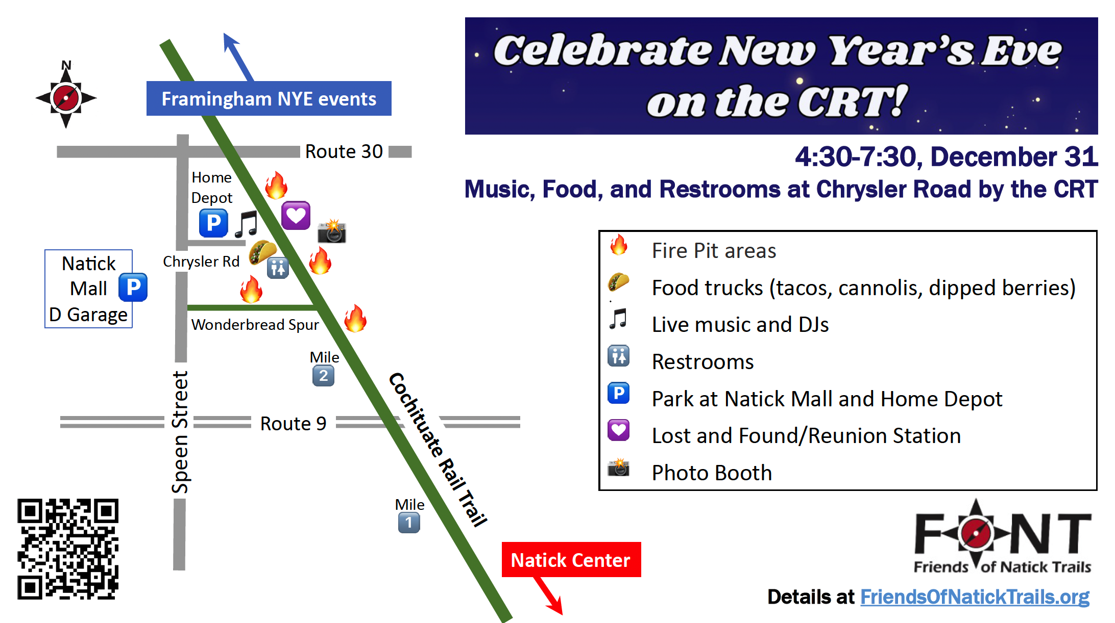 The entire CRT from Mechanic Street to Route 30 is part of the New Year’s Eve event. There will be fire pits between Superior Drive (at Amvets) and Route 30, and on the Wonderbread Spur leading to the Natick Mall. We will have lighting along the CRT from Mechanic Street to the north.